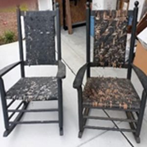 Several years ago I was able to get my hands on three wooden rocking chairs that spent many years rocking folks on my grandfather’s front porch. He passed away in 1956, and my grandmother passed away in 1983. So these chairs have been around a long, long time. Here is an picture of two of the chairs before I began my restoration. I cut away all of the old caning. I sanded the chairs all the way down to the raw wood. These chairs were painted by my granddad who died 69 years ago. So the old paint had to go. This took some effort, a fair amount of elbow grease and a large dose of patience. No use getting in a hurry. The rule is always, “If you want to take the fastest path, GO SLOW!”