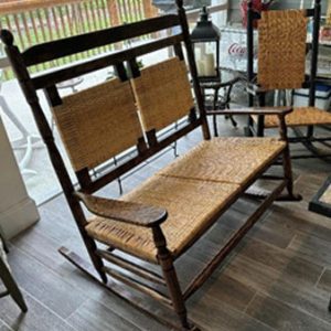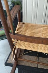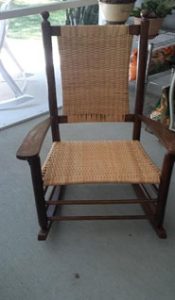 To the right is your finished chair with the New England weave on both the seat and the back of the rocker. You can also see the new finish on the wood frame of the chair. Compared to the pictures we started with this chair looks like “new money”! But it still sits and rocks like a very old, dear friend. Oh, and tales this chair could spin if it could talk.