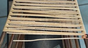 Here is a picture of the looping of a chair. This weave is the New England weave. As you can see, there are two long strands, then, you see two quick loops on each side. Then you repeat the two long strands and the two quick loops on each side. This looping pattern is continued until you have completely crossed the entire span. Now your base looping is done.